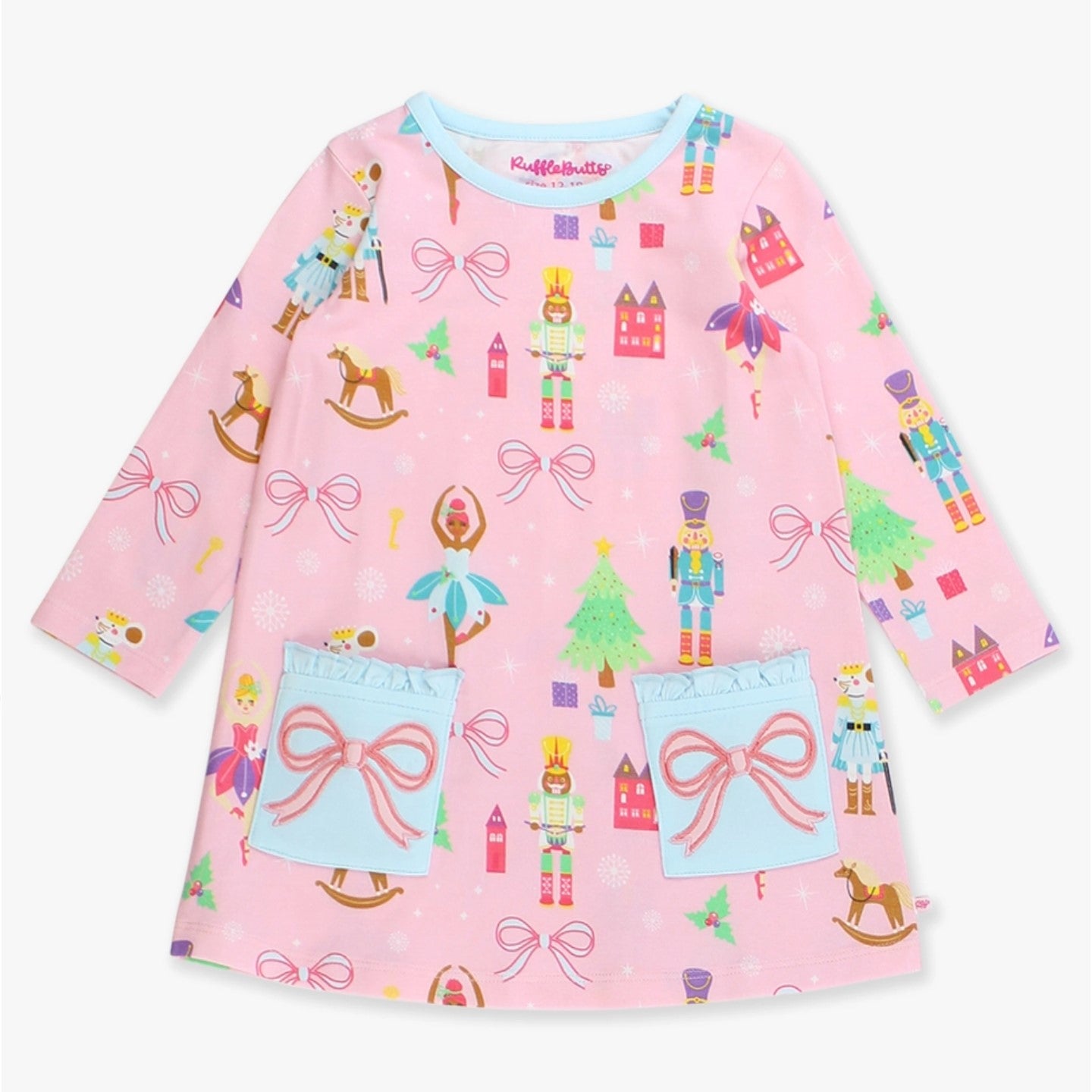 This sweet A-line knit dress is the perfect combination of trendy and classic! The functional patch pockets have adorable applique designs that tie the whole look together. Nutcrackers, ballerinas, and toy soldiers make this candy-colored print perfect for attending a holiday ballet!
